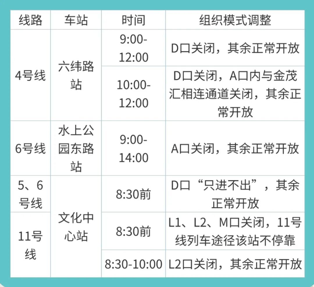 结合赛事官方组委会要求,4、5、6、11号线部分车站出入口将分时段临时调整,11号线文化中心站8:30前实施关闭。