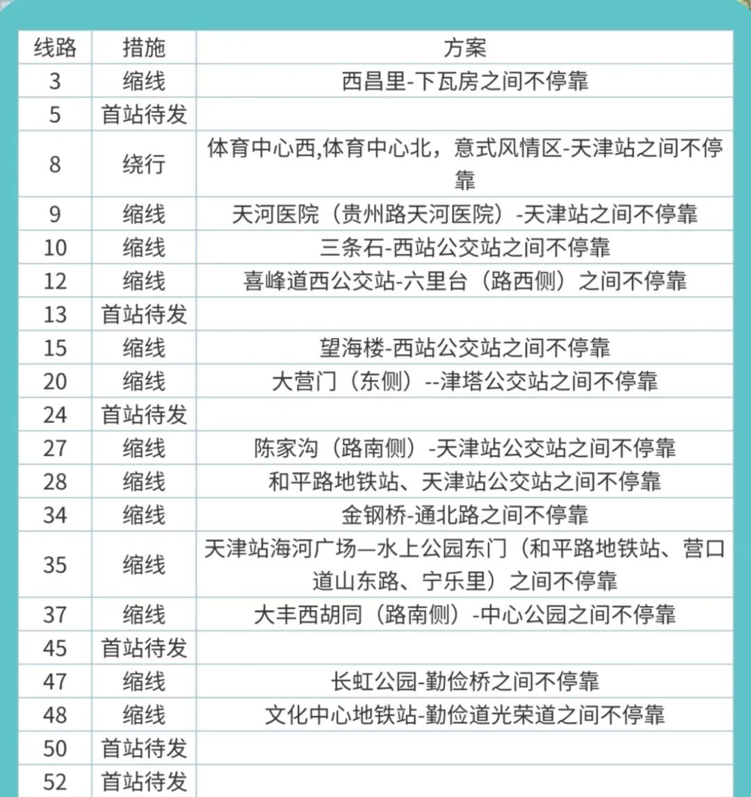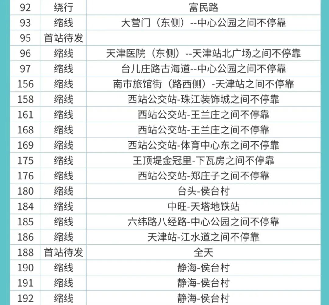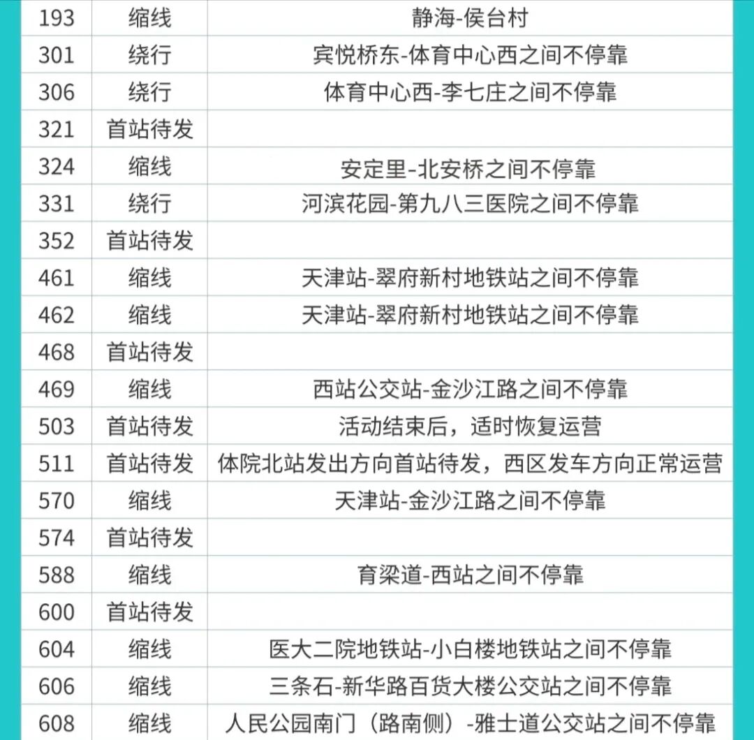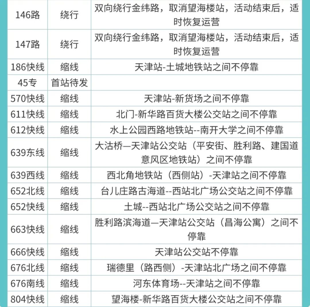 配合我市公安交管局发布的《2025天津马拉松赛事期间对相关道路实施交通管控措施的公告》,10月26日,我市对190条公交线路进行适时调整,具体结束时间以公安封控时间为准。具体如下: